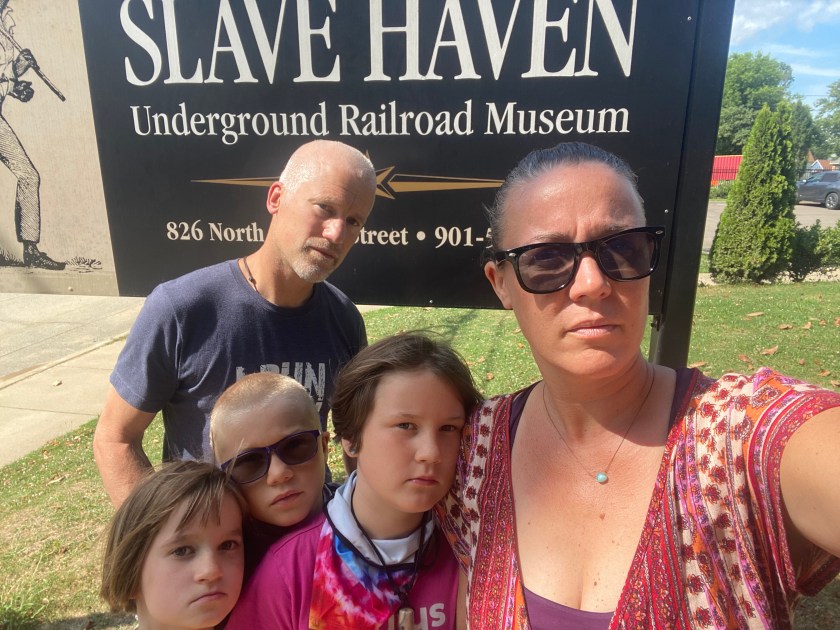 The Burke Estate, now known as Slave Haven Underground Railroad Museum, was once a stop for enslaved Africans fleeing work camps to find freedom in Canada. This Black family owned business is owned and operated by a mother and her two daughters. The tour included exploring the house, the highlight of which was going into the cellar where people would have hid until the safety of nighttime and stormy weather. We learned about the history of the transatlantic slave trade, saw art, artifacts and secret quilt patterns / symbols that were used to communicate without being recognized by neighbors. This was one of the children’s highlights of our 5 week journey. I think that the underground railroad leaves us with a sense of hope, hope that there are good people in the world. So much on our journey was devastating and dark, the idea that some enslaved folks would find freedom and that some allies were helping along the way gave us necessary hope that not all of humanity is evil.