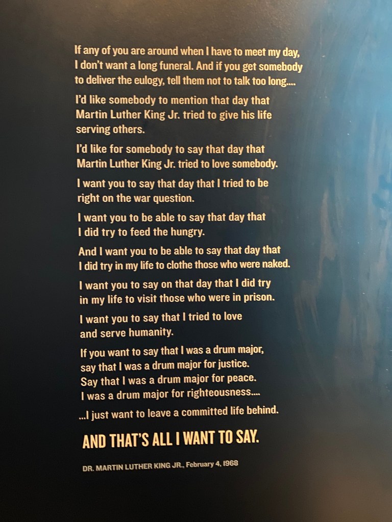 The museum is a tribute to Dr. King and also took us on an exploratory tour of the journey from Africa to the middle passage, slavery, Jim Crow and segregation to help us understand what Dr. King was working in opposition to during the Civil Rights era. It has life sized replicas of the Woolworth sit in and Rosa Parks on the bus during the Montgomery Bus Boycott in 1955.