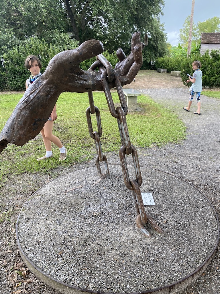 The grounds are also home to some incredibly moving sculptures. Preparing yourself, and your children if you are bringing them, was helpful since many of the sculptures were very emotionally triggering, such as the garden with stakes that had decapitated heads stuck on them in the above image. Something that would happen if an enslaved person attempted to run away to scare the other enslaved people from trying it themselves. Walking around the plantation it was difficult not to imagine how a person might try to run in the night, as we learned in the Slavehaven Underground Railroad, in a huge storm so that dogs would lose their scent. The grounds butt up to swamp lands ripe with alligators, water moccasins and other deadly wildlife, a fate that many would risk rather than staying on the plantation where they would be imprisoned, beaten, bred, raped and never with the possibility of freedom for them or their loved ones.
