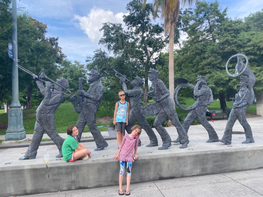 Like many sites in the south, this city park was an important site in the slavery era as well as during integration through the arts and music in the 1920’s-1940’s. Congo Square was a place that enslaved Africans and descendants of Africans would gather on a Sunday, a day that they MIGHT be awarded to visit with friends or lovers from other work camps (aka plantations) after church service. When we visited the square was full of drumming and Black artists selling homemade salves, kombucha and jewelry. It still felt like a hub of African American community and music. The park is also located adjacent to the Tremé neighborhood, birthplace to many of the most famous jazz musicians in NOLA. There are beautiful statues of a NOLA jazz band and of Louis Armstrong himself.