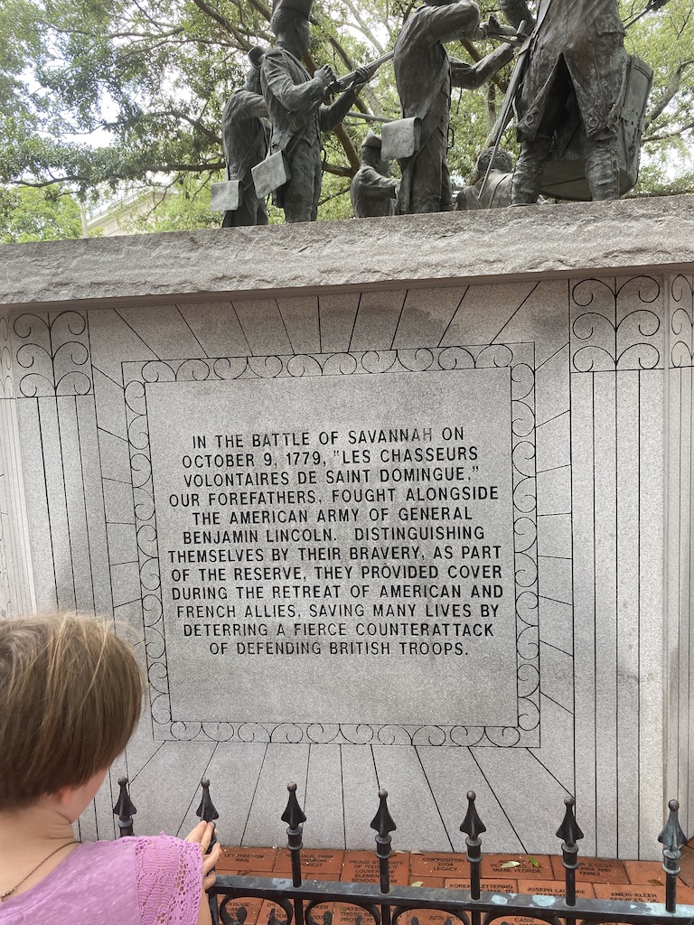 The Haitian Monument was commissioned and constructed to illuminate the role of Black soldiers in the Revolutionary War. Like much Black American history, the story of 545 Black Haitians that were recruited from the French colony of Chasseurs-Volontaires de Saint Domingue to fight during the Siege of Savannah in 1779. Although they had been enlisted to occupy an auxiliary role, the Chasseurs-Volontaires did fight in the front lines for American freedom. Although many of the Haitian soldiers had been enslaved they were offered freedom in exchange for their service against the British troops. Many southern slave owners resisted allowing their prisoners to enlist, even though there was a shortage of willing soldiers, they were afraid that if too many Black Americans were free there would be a revolt against slavery. If a white captor allowed their captive to be free they were to pay a significant tax. So, due to this resistance from the wealthy slave holders there was a tax exemption made for those who allowed they prisoners to be free to fight in the war.